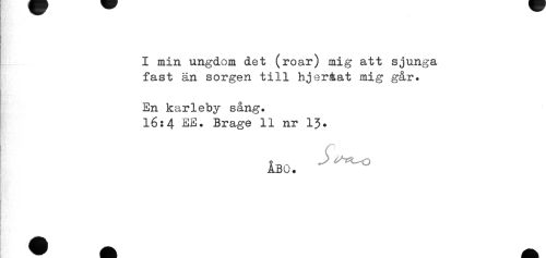 //// I min ungdom det (roar) mig att sjunga //// fast än sorgen till hjeråat mig går. //// En karleby sång. //// 16:4 EE. Brage 11 nr 13* //// ÅBO. ////