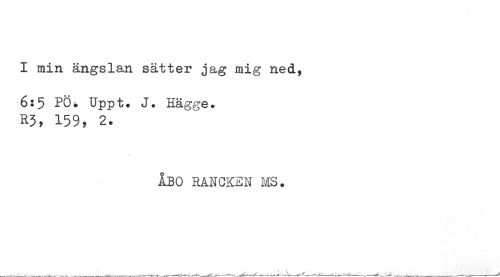 //// I min ängslan sätter jag mig ned, //// 6:5 PO* Uppt. J. Hägge. //// R3, 159, 2. //// ÅBO RANCKEN MS. ////