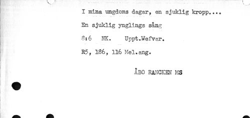 //// I mina ungdoms dagar, en sjuklig kropp.... //// En sjuklig ynglings sång //// 8:6 NK. Uppt.Wefvar. //// R5, 186, 116 Mel.ang. //// ÅBO R&NCKEN MS ////
