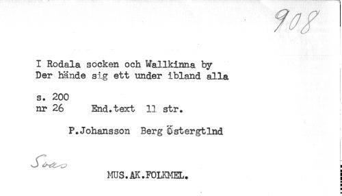 //// I Rodala socken och Mallkinna by //// Der hände sig ett under ibland alla //// s. 200 //// nr 26 End.text 11 str. //// i //// P.Johansson Berg Cstergtlnd //// HUS.AK.FOMHEL. } //// ä //// H //// * = ////