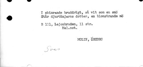 //// I skimrande bruddrägt, så vit som en snö //// ^^ Står djurtämjarns dotter, en blomstrande mö //// B 111, Lejonbruden, 11 str. //// Mel.not. //// t < //// MOLIN, &KEBR0 //// ___ _ r- ////