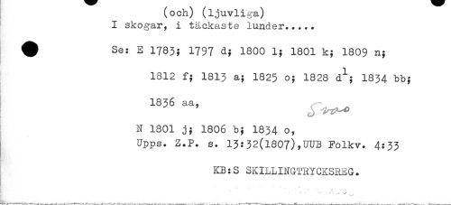 //// l^ocnj ^ljuvliga; //// I skogar, i täckaste lundar...*. //// ^ Se: E 1783; 1797 d; 1800 1; 1801 k; 1809 n; //// 1812 f; 1813 a; 1825 o; 1828 d"*"; I834 bb; //// 1836 aa, ^ ^ //// N 1801 j; 1806 b; I834 o, //// Upps. Z.P. s. 13:32(1807),^B Folkv. 4:33 //// KB:S SKILLINGTRYCKSREG. //// t - . * t ////