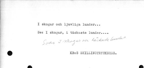 //// I skogar och ljuvliga lundar... //// Se: I skogar, i täckaste lundar.... //// ^ KB:S SKILLINGTRYCKSREG. ////