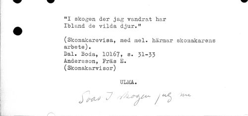 //// "I skogen der jag vandrat har //// ^^ Ibland de vilda djur." //// (Skomakarevisa, med mel. härmar skomakarens //// arbete). //// Dal. Boda, 10167, s. 31-33 //// Andersson, Fräs E. //// (Skomakarvisor) //// ULMA. //// j ^^ / //// ._____ _____ / . . . ______ ////