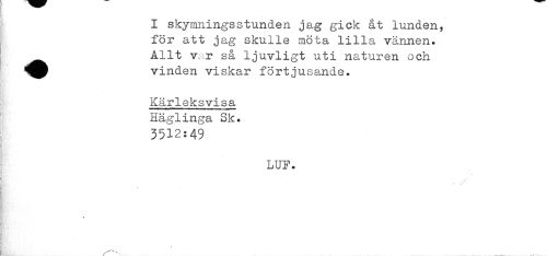 //// I skymningsstunden jag gick åt lunden, //// ! för att jag skulle möta lilla vännen. //// ^ Allt var så ljuvligt uti naturen och //// ^^ vinden viskar förtjusande. //// * //// i Kärleksvisa //// Häglinga Sk. //// ' 3512:49 //// - //// I LUF. //// ) //// t //// r / * _____ ______ ////