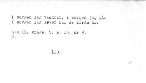 //// I sorgen jag vandrar, i sorgen jag går //// I sorgen jag larver här år ifrån år. //// 3:4 KB. Brage. 5. s. 13. nr 9. //// N. //// ÅBO. ////