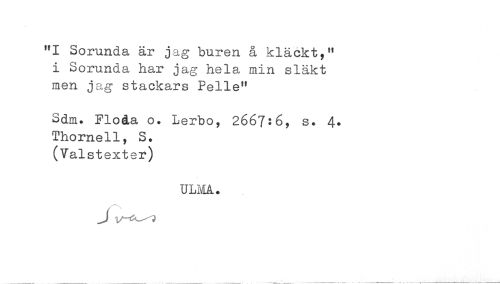 //// "I Sorunda är jag buren å kläckt," //// i Sorunda har jag hela min släkt //// men jag stackars Pelle" //// Sdm. Floåa o. Lerbo, 2667:6, s. 4. //// Thornell, S. //// (Valstexter) //// ULMA. ////