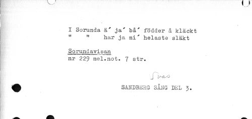 //// I Sorunda ä' ja' bå' födder å kläckt //// " " har ja mi' helaste släkt //// Sorundavisan //// nr 229 mel.not. 7 str. //// } J ^ //// SANDBERG SANG DEL 3. ////