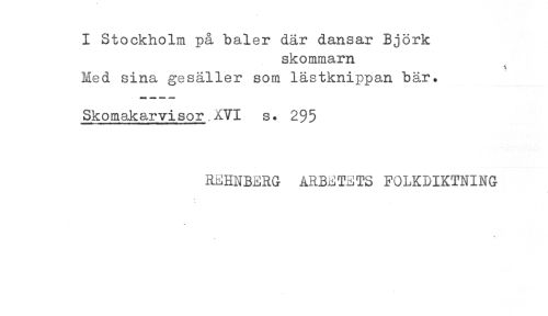 //// I Stockholm på baler där dansar Björk //// skommarn //// Med sina gesäller som lästknippan bär. //// Skomakarvisor.XVI s. 295 //// REHNBERG ARBETETS FOLKDIKTNING ////
