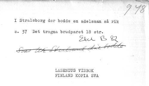 //// I Stralsborg der bodde en adelsman så rik //// s. 37 Det trogna brudparet 18 str. //// v //// LASENIUS VISBOK //// FINLAND KOPIA SVA ////