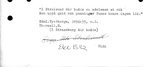 //// "I Stralsund där bodde en adelsman så rik //// Men uppå guld och penningar fanns honom ingen lik. //// ^ Sdml.Tystberga, 2894:35, s.2. //// Thornell,S. //// (i Strassburg där bodde) //// j //// .. ////