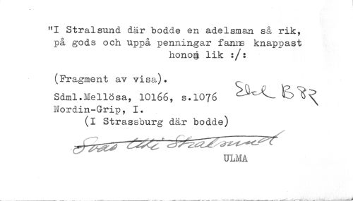 //// "I Stralsund där bodde en adelsman så rik, //// på gods och uppå penningar fanns knappast //// hono$ lik :/: //// (Fragment av visa). //// Sdml.Mellösa, 10166, S.IO76 ^^^^^^ //// Nordin-Grip, 1. //// (i Strassburg där bodde) //// ULMA ////