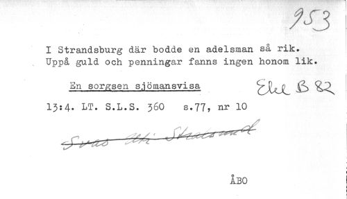 //// I Strandsburg där bodde en adelsman så rik. //// . Uppå guld och penningar fanns ingen honom lik. //// En sorgsen s.i ömansvisa ^ ^ ^^ //// 13:4. LT. S.L.S. 36O s.77, ur 10 //// ÅBO ////