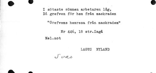 //// I sötaste sömnen arbetaren låg, //// Då grefven för hem från maskraden //// "Grefvens hemresa från maskraden" //// Nr 446, 18 str.Ingå //// Mel.not //// LAGUS NYLAND ////