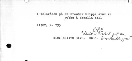 //// I Tolaråsen på en branter klippa stod en //// gubbe å skralla ball //// 11482, s. 795 //// ULMA BLIXTS SAI€L. OBSC. ////