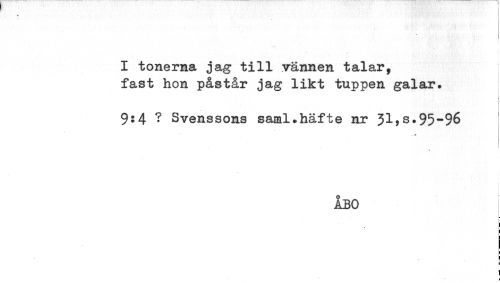 //// T //// I tonerna jag till vännen talar, //// fast hon påstår jag likt tuppen galar. //// 9:4 ? Svenssons saml.häfte nr 31,s.95-96 //// . ** //// ÅBO //// f //// t //// C //// ! ////