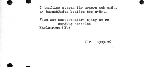 //// I torftiga stugan låg modern och gråt, //// av barnsbörden kvaldes hon svårt. //// Visa som positivhalare sjöng om en //// sorglig händelse //// Karlskrona (Bl) //// * //// LUF 8989:86 //// * ////