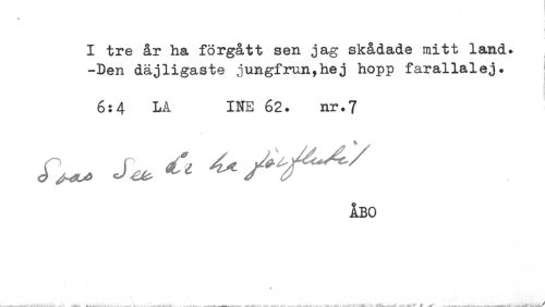 //// I tre år ha förgått sen jag skådade mitt land. //// -Den däjligaste jungfrun,hej hopp farallalej. //// < i //// 6:4 LA INE 62. nr.7 //// ÅBO ////