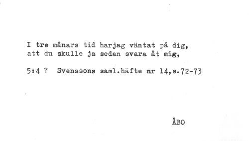 //// I tre månars tid harjag väntat på dig, //// att du skulle ja sedan svara åt mig, //// 5:4 ? Svenssons saml.häfte nr 14,s.72-73 ////
