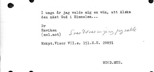 //// I unga år jag valde mig en vän, att älska //// den näst Gud i Himmelen... //// Mskpt.Visor VII.s. l^l.E.U. 28891 ////