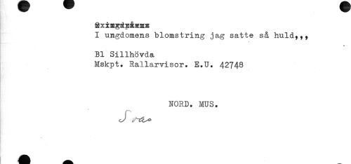 //// Sximgiip&amK //// I ungdomens blomstring jag satte så huld,,. //// Bl Sillhövda //// Mskpt. Rallarvisor. E.U. 42748 //// NORD. MUS. //// v ////