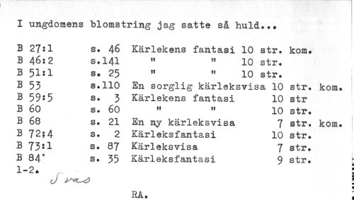 //// B 27:1 s. 46 Kärlekens fantasi 10 str. kom. //// B 46:2 s.141 " " 10 str. //// B 51:1 s. 25 " " 10 str. //// B 53 s.110 En sorglig kärleksvisa 10 str. kom. //// B 59:5 s. 3 Kärlekens fantasi 10 str //// B 60 s. 60 " " 10 str. //// B 68 s. 21 En ny kärleksvisa 7 str. kom. //// B 72?4 s. 2 Kärleksfantasi 10 str. //// B 73:1 s. 87 Kärleksvisa 7 str. //// B 84' s. 35 Kärleksfantasi 9 str. ^ //// 1-2. ; //// RA. : ////