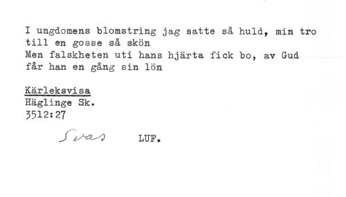 //// I ungdomens blomstring jag satte så huld, min tro //// till en gosse så skön //// Men falskheten uti hans hjärta fick bo, av Gud //// får han en gång sin lön //// Kärleksvisa //// Häglinge Sk. //// 3512:27 //// LUF. ////