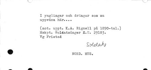 //// * //// - //// I ynglingar och drängar som nu //// uppväxa här...* //// (not. uppt. K.A. Rignell på 1890-tal.) //// Mskpt. Soldatsånger E.U. 29I83. //// Vg Fristad //// ^ NORD. ms. ////