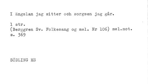 //// ) //// I ängslan jag sitter och sorgsen jag går. //// 1 str. //// (Berggren Sv. Folkesang og mel. Nr 106) mel.not. //// s. 369 //// i //// SÖDLING MS ////