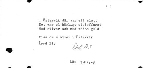 //// I c //// - //// I Östervik där var ett slott //// Det var så härligt utstofferat //// Med silver och med rödan guld //// Visa om slottet i Östervik //// LUF 720:7-9 ////