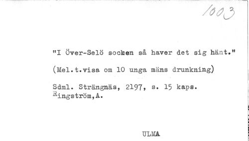 //// "I Över-Selö socken så haver det sig hänt." //// (Mel. t. visa om 10 unga mäns drunkning) //// Sdml. Strängnäs, 2197? s. 15 kaps. //// ^ingström,A. //// [ //// ULNA ! ////