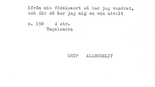 //// Ifrån min födelseort så har jag vandrat, //// och där så har jag mig en vän utvalt //// s. 198 4 str. //// Tegelsmora //// < //// GRIP ALLMOGELIV ////