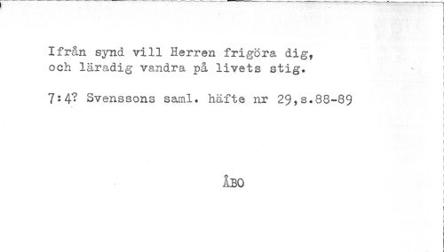 //// Ifrån synd vill Herren frigöra dig, i //// och läradig vandra på livets stig. //// t //// 7:4? Svenssons saml* häfte nr 2$,s.88-89 //// f //// t //// f //// f //// ÅBO //// ! //// ! //// i //// t //// i //// < ////