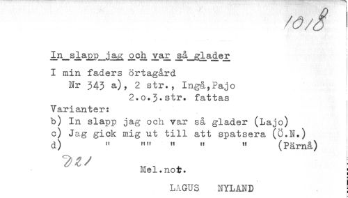 //// t //// t //// In slapp _och _så__glade_r //// I min faders örtagård //// Nr 343 a), 2 str., Ingå,Pajo //// 2.o.3*str. fattas //// Varianter: //// b) In slapp jag och var så gläder (Lajo) //// c) Jag gick mig ut till att spatsera (O.N.) //// d) " "" " " " (Pärnå) //// Mel.not. ; //// LAGUS NYLAND ; //// < ////