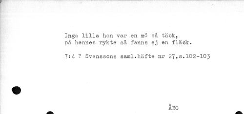 //// Inga lilla hon var en mö så täck, //// på hennes rykte så fanns ej en fläck. //// 7:4 ? Svenssons saml.häfte nr 27,s.102-103 //// ÅBO ////