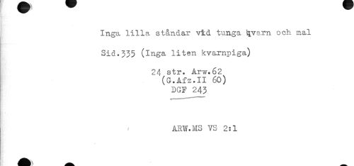 //// Inga lilla ståndar vid tunga ^varn och mal //// Sid.335 (inga liten kvarnpiga) //// 24 str. Arw.62 //// (G.Afz.II 60) //// DGF 243 //// ARW.MS VS 2:1 ////