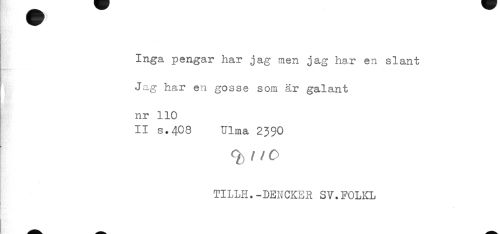 //// ^^ <' //// Inga pengar har jag men jag har en slant //// Jag har en gosse som är galant //// nr 110 //// II s.408 Ulma 2390 //// ! //// TILLH.-DENCKER SV.FOLKL //// i ////
