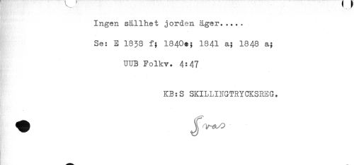 //// ' t //// Ingen sällhet jorden äger..... //// Se: E 1838 f; 1840$; 1841 a; 1848 a; //// UUB Folkv. 4:47 //// KB:S SKILLINGTRYCKSREG. ////