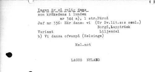 //// jLR^en d.ans_ //// som kråkedans i lunden //// nr 344 a)? 1 str.Pärnå //// Jmf nr 336^ Här dansa vi (Ur Sv.lit.s:s seml.) //// Borgå,Lappträsk //// Variant Liljendal //// b) Vi dansa ofvanpå (Helsinge) //// Mel.not //// LAGUS NYLABD ////