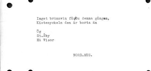 //// Inget brännvin få^iu denna gången, //// Kistenyckeln den är borta än //// Og //// St.Åby //// HA Visor //// ' //// NORD.MUS. ////