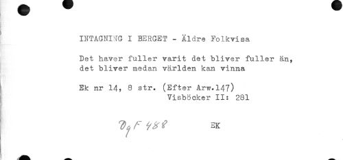 //// ) //// INTAGMIYG I BERGET - Äldre Folkvisa //// Det haver fuller varit det bliver fuller än, //// det bliver medan världen kan vinna //// Ek nr 14, 8 str. (Efter Arw.147) //// Visböcker II: 281 //// /" ^^ EK //// t //// ! ^^^^^ - - ////