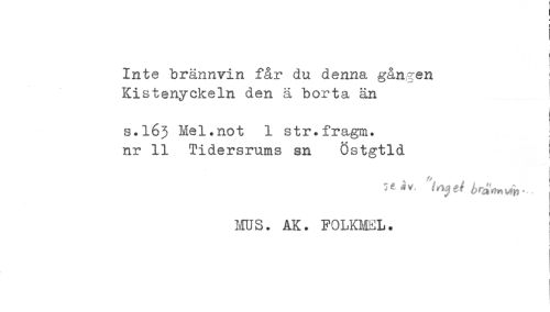 //// j //// Inte brännvin får du denna gången i //// Kistenyckeln den ä borta än //// s.163 Mel.not 1 str.fragm. //// nr 11 Tidersrums sn Östgtld //// ms. AK. FOLKMEL. ! //// ! //// j ////