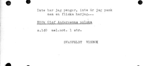 //// Kr''- //// Inte har jag pengar, inte är jag pank //// men en flicka harjag... //// Höök Olof Anderssons polska //// [ //// s.140 mel.not. 1 str. //// SVANFELDT VISBOK ////