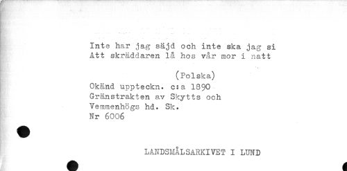 //// ' //// Inte har jag säjd och inte ska jag si //// Att skräddaren la hos vår mor i natt //// < //// (Polska) //// Okänd uppteckn. c:a 18$0 //// Gränstrakten av Skytts och //// Vemmenhögs hd. Sk. //// Nr 6006 //// LANDSMÅLSARKIVET I LUND ////