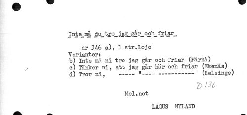 //// Inte må du tro jag_^r och //// ^MHH ^HH* ^HH^ tHH^ //// nr 346 a), 1 str.Lojo //// Varianter: ^ //// b) Inte må ni tro jag går och friar (Pärna) //// ^ c) Tanker ni, att jag går här och friar (Ekenäs) //// d) Tror ni, -----"----- (Helsinge) //// Mel.not //// LAGUS NYLAND ////