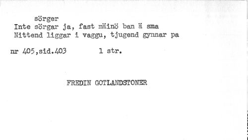//// sorger //// Inte sorgår ja, fast siäinö b an a sina //// Nittend liggar i vagga, tjugend gynnar pa //// < //// < //// nr 405,sid.403 1 str. //// < //// < //// i //// FREDIN GOTLANDSTONER //// i //// ) //// i //// i //// ! //// B //// i ////