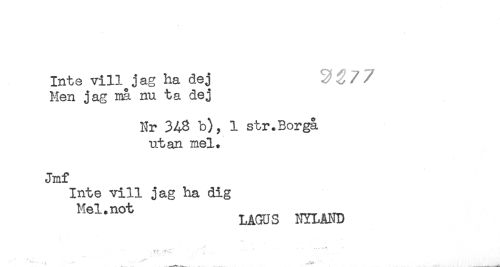 //// Inte vill jag ha dej 3*^77 //// Men jag ma nu ta dej //// Nr 348 b), 1 str.Borgå //// utan mel. //// Jmf //// Inte vill jag ha dig //// Mel.not ^^ //// LAGUS NYLAND //// - . ' " ' ' ..... ////