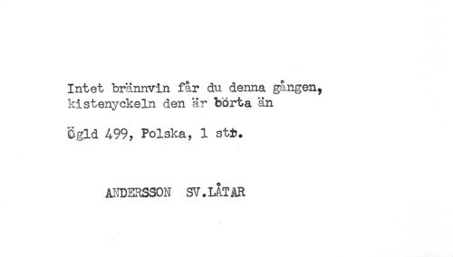 //// Intet brännvin får du denna gängen, //// kistenyckeln den är borta än //// Sgld 499, Polska, 1 sti?. //// ANDERSSON SV.LåTAR //// < ////
