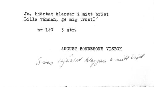 //// Ja, hjärtat klappar i mitt bröst //// Lilla vännen, ge mig trösta //// nr 140 3 str. //// AUGUST BONDESONS VISBOK //// .-* ^t '^ * -_-t . ^ ^ -- t 1 , t---SV----- ' * * ___---- ////