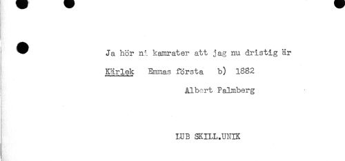 //// ! H H //// ^ Ja hör ni kamrater att jag nu dristig är //// Kärlek Emmas första b) 1882 //// i //// : Albert Palmberg //// t //// I.UB SKILL.UNIK ////